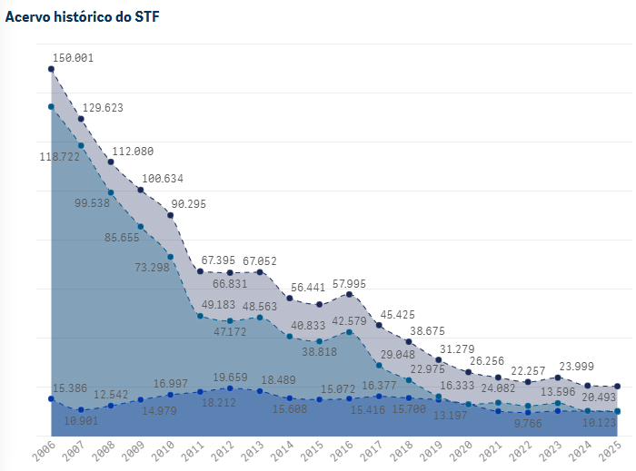 A análise quantitativa da performance do Supremo Tribunal Federal em 2025 revela um fenômeno de “enxugamento” sem precedentes. O acervo de aproximadamente 20 mil processos representa uma redução de aproximadamente 87,6% em relação ao pico histórico de mais de 150.000 processos registrado em meados dos anos 2000, alcançando o menor patamar desde 1993, segundo dados da Secretaria de Gestão Estratégica do STF. Este indicador, celebrado institucionalmente como o triunfo da gestão de precedentes, esconde uma complexidade qualitativa: a Corte está julgando mais, porém está julgando diferente.
